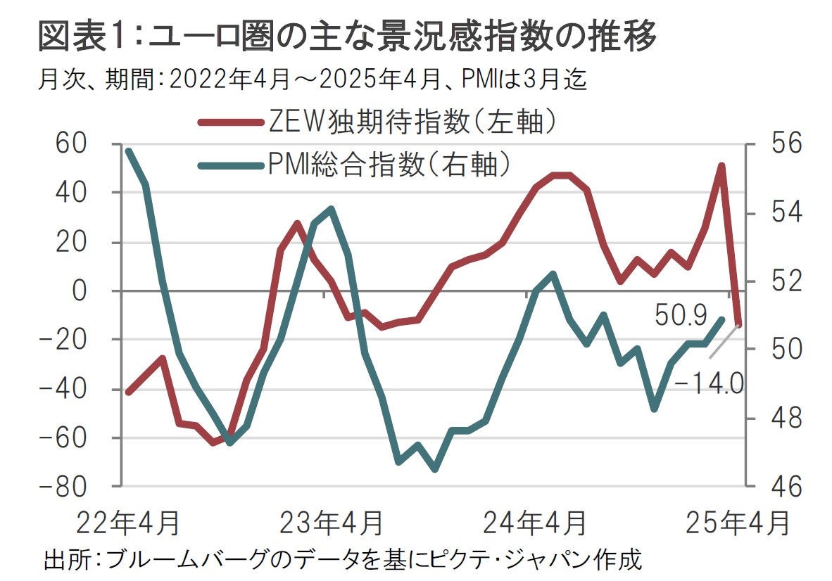 欧州経済研究センター(ZEW)が4月15日に発表した4月の期待指数はマイナス14と、市場予想の(プラス)10、3月の51.6から大幅に低下した(図表1参照)。ユーロ圏で最大の経済規模を持つドイツの景況感は、3月に財政政策拡大への期待から急回復したが、4月はトランプ大統領の関税政策を受け急速に悪化した。