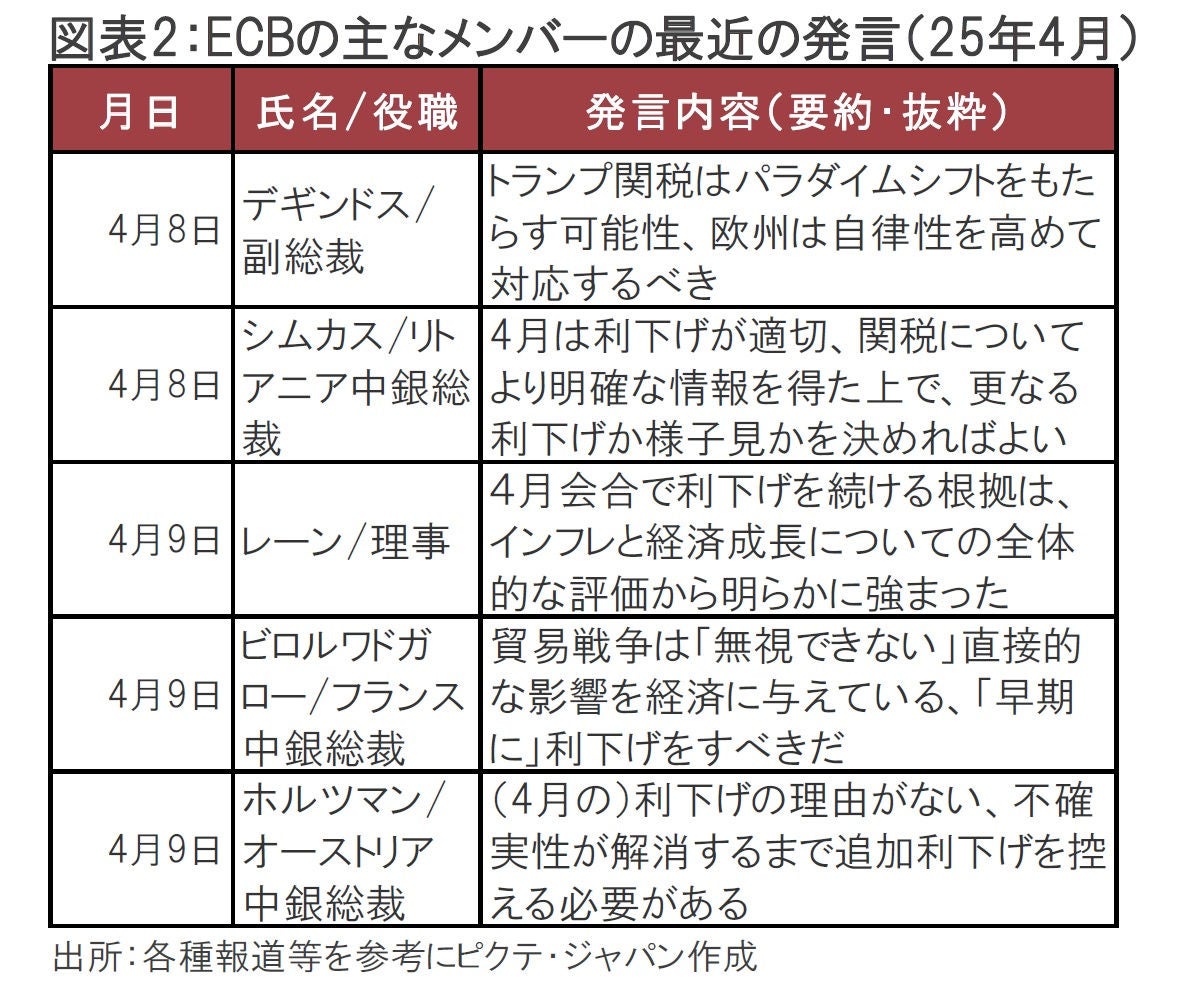 ECBは4月17日に政策理事会(会合)を終えて、金融政策の結果を発表する予定だ。先物市場などが織り込む市場予想を見ると、4月会合では0.25%の利下げが見込まれている。4月会合を控え、金融政策についての発言を控える期間(ブラックアウト)前のECBメンバーの主なコメントを振り返っても(図表2参照)、4月の利下げに反対しそうなのはオーストリア中銀のホルツマン総裁らに限られそうだ。他のタカ派(金融引き締めを選好)メンバーであるシュナーベル理事は5日にトランプ関税を批判するコメントをしているが、追加利下げについては、ユーロ圏の物価鈍化が進行している点を指摘するなど、今回の利下げを明確には否定していない印象だ。
