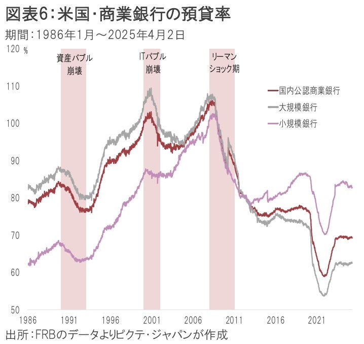 一方、ITバブル期やリーマンショック期を振り返ると、米銀の預貸率は100%を超えていた。そうしたなか、何等かのショックで預金の引き出しが加速すると、現金を確保するため、米銀は資産の売却、貸し渋り・貸し剥がしを行わざるを得ず、景気に深刻なダメージが生じたのである。