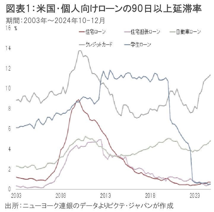 ニューヨーク連銀によれば、クレジットカードの与信に関する90日以上の延滞率は、昨年10-12月期、11.35%になった(図表1)。リーマンショックの影響が残っていた2011年12月末以来の高水準である。2022年9月末は7.59%であり、その後、FRBによる利上げの影響が顕在化した模様だ。一方、住宅ローンの延滞率は0.70%に止まった。