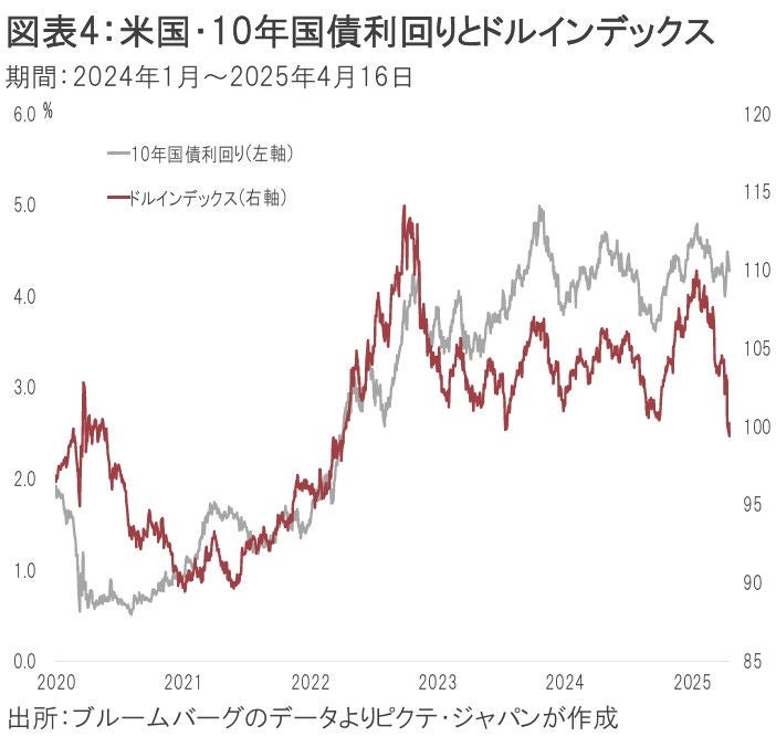 トランプ関税に関する市場の懸念は、ドル離れの要因となっている模様だ。新型コロナ禍以降、ドルインデックスは米国の長期金利に連動する傾向を示してきた(図表4)。しかし、4月2日に相互関税の内容が発表されて以降、10年国債の利回りが上昇したにも関わらず、ドルは下落している。