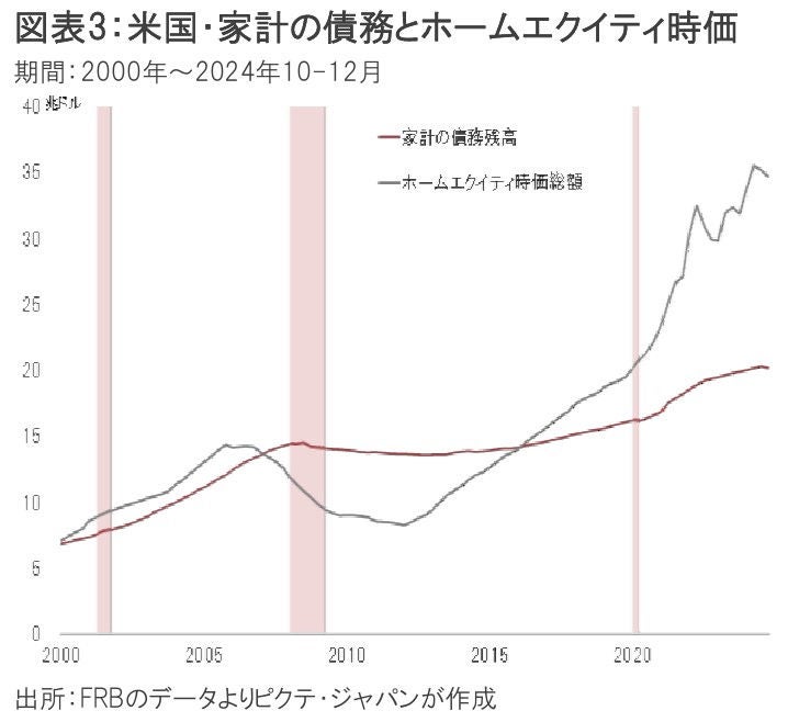 二つ目の理由は、深刻な人手不足で住宅建設コストが急騰、ホームエクイティの時価が上昇したことだ(図表3)。リーマンショック期には、ホームエクイティの時価が家計の債務額を下回り、米国の家計は実質的な債務超過に陥った。その結果、与信がさらに絞り込まれ、GDPの約7割を占める個人消費の落ち込みが危機を加速させたのである。