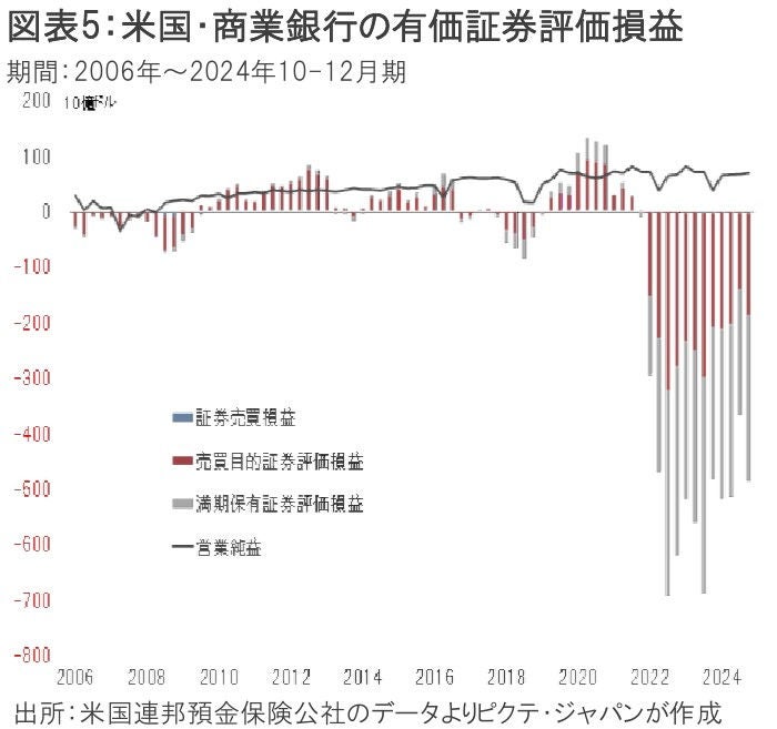 有価証券投資の評価損益を米銀全体で見た場合、2021年9月末は23億ドルの評価益だったものの、2023年9月には6,839億ドルの評価損になった。SVBの他、2023年3月12日にはニューヨーク州のシグネチャー・バンク、4月26日にはカリフォルニア州のファースト・リパブリック・バンクが取り付けに対応できず破綻に追い込まれている。欧州でも、3月20日にUBSによるクレディ・スイスの救済合併が発表され、2023年春は世界的な金融危機の可能性が懸念された。