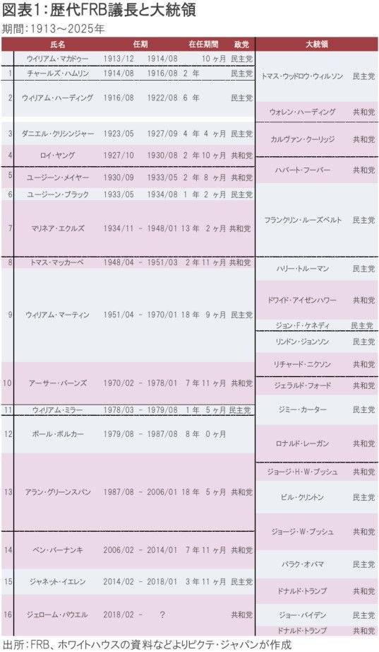 歴代議長に関し、民主党の大統領は民主党員、共和党の大統領は共和党員を据える傾向がある(図表1)。例外は共和党のウォーレン・ハーディング大統領に指名された第3代のダニエル・クリシンジャー、民主党のフランクリン・ルーズベルト大統領が指名したマリネア・エクルズの二人だ。