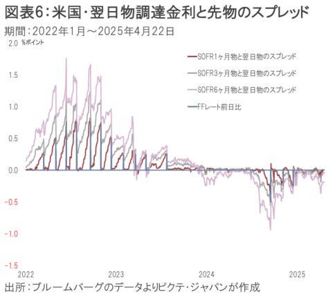 トランプ大統領が、意に沿わぬパウエル議長を疎ましく思っていることは間違いない。しかし、同議長の更迭には司法の高い壁がある上、市場から手痛い反発を受ける可能性が強い。そのリスクを考えれば、実現は困難だろう。指標である無担保翌日物調達金利(SOFR)の先物とのスプレッドは、政策金利の据え置きを織り込む水準だ(図表6)。