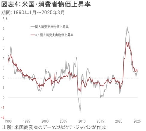 足下、確かにインフレ率は縮小している。しかし、トランプ政権による関税政策が物価に及ぼす影響は不透明だ。関税そのものが物価を押し上げる上、人手不足の米国へ工場が国外からシフトすれば、さらなる資材高騰や賃上げの要因になり得る。