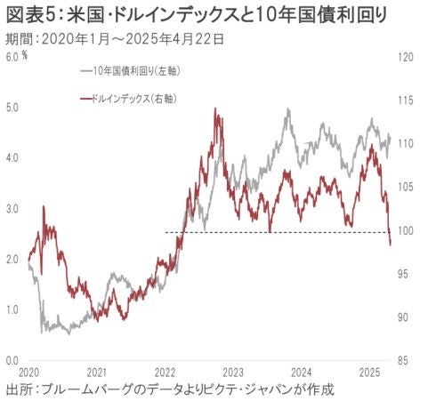 そうしたなか、大きな懸念はドルの急落だろう(図表5)。ドル高は高関税率の下で米国の物価を安定させる手段の一つだが、むしろ市場は逆方向へ動いている。トランプ大統領が自らパウエル議長の解任を否定し、4月23日にウォールストリートジャーナルが対中関税見直しをホワイトハウスが検討していると報じたのは、政権が市場の反応、特に急激なドル離れを懸念した結果と見られる。