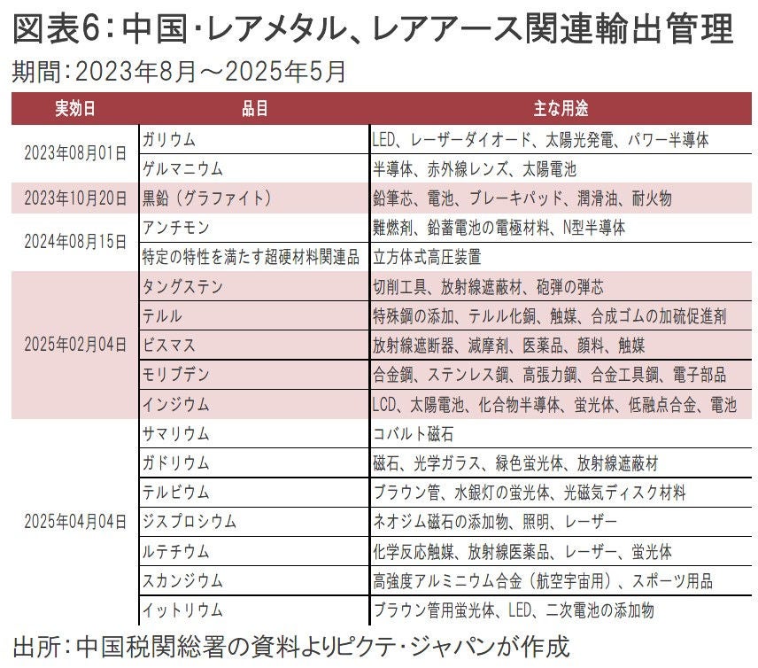 2023年8月1日以降、米国による実質的な対中制裁に対抗して、中国はレアメタル、レアアースに関する輸出管理を強化してきた(図表6)。再選されたドナルド・トランプ大統領が就任、主な通商相手へ関税による実質的な制裁措置を講じるなか、習近平政権は、今年2月4日と4月4日、輸出管理を厳格化する品目を大幅に増やしている。