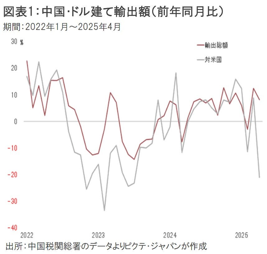 通商協議に先立つ5月9日、中国税関総署は4月の貿易統計を発表、財・サービスの対米輸出は21.0%の減少だった(図表1)。1-3月は前年同期比4.5%の増加なので、4月9日に導入された相互関税の影響が数字に表れたと言えよう。