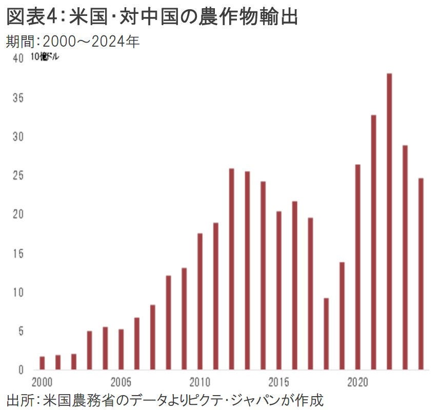 米国において、対中通商戦争の影響を強く受けているのが農業ではないか。2022年に過去最大の381億ドルを記録した米国の対中農作物輸出額は、昨年、247億ドルへ減少した(図表4)。対中関税が大幅に引き上げられた今年4月以降はさらに状況が悪化した模様だ。農村地帯は伝統的に共和党の支持層が多く、トランプ政権としても農業従事者の苦境は無視できないだろう。