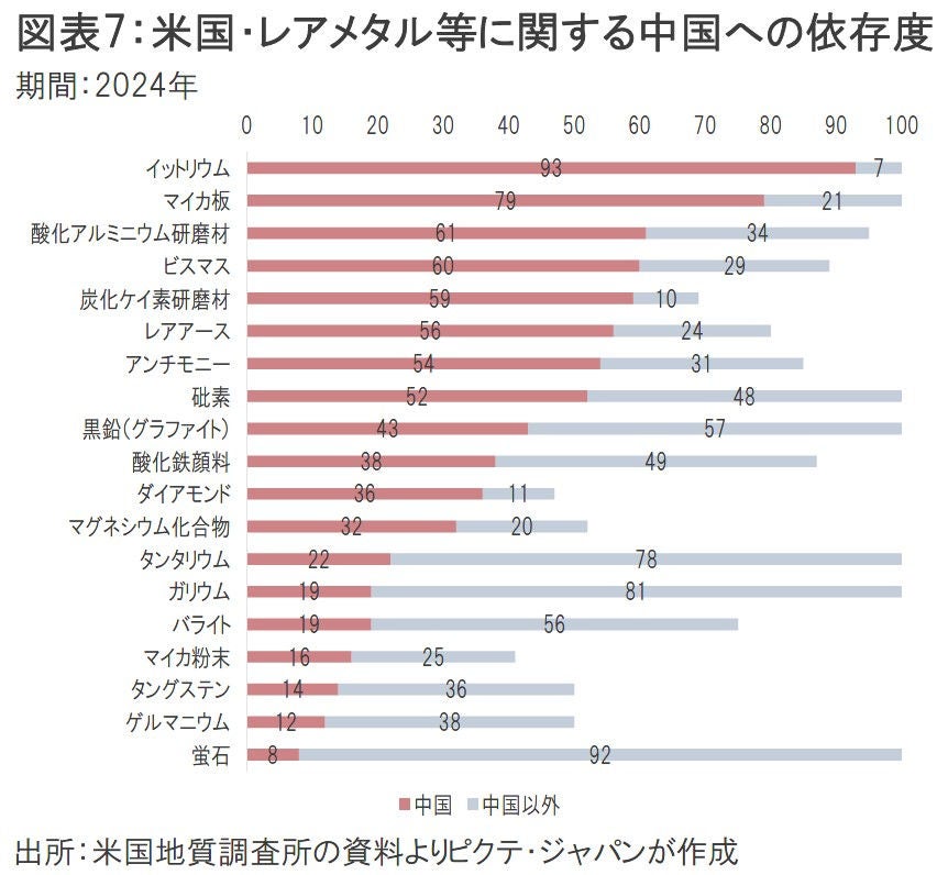 米国は、多くのレアメタル、レアアースに関し、依然、中国への依存度が高い(図表7)。これらの希少金属類は、トランプ大統領が重視する製造業強化には欠かせない戦略物資であり、調達の多様化は米国にとり喫緊の課題と言える。ただし、それは一朝一夕に実現できることではなく、当面、中国からの調達に依存せざるを得ないだろう