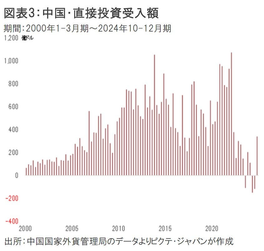 また、昨年、中国への外国からの直接投資は辛うじて1億8,600万ドルの流入超過だったが、四半期ベースだと、4-6月期、7-9月期に計2億6,600万ドルの流出超過だった(図表3)。経済成長を維持する上で、外資系企業の投資による技術革新は極めて重要だ。通商戦争の下、米国企業による対中直接投資がこれ以上細る事態は、習近平政権としても避けたいところだろう。