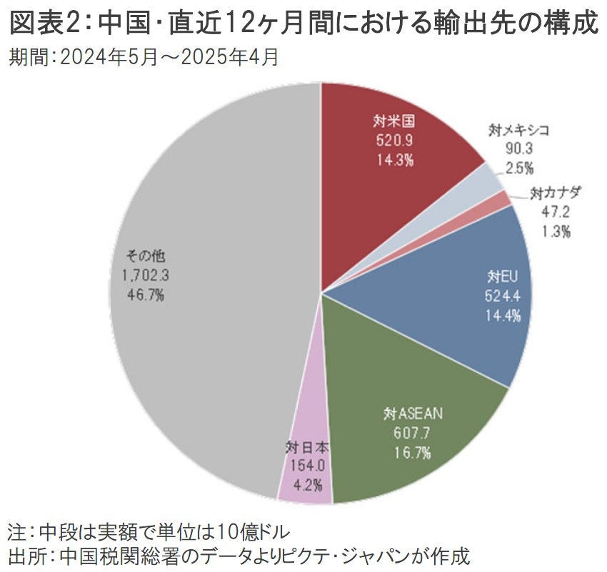 成長が鈍化する中国にとり、米国との通商戦争は新たな重荷に他ならない。ただし、これまで強気の姿勢を崩さなかった理由の一つは、輸出先の分散化を進めてきたことではないか。今年4月までの直近12ヶ月間、全輸出額に占める米国の比率は14.3%だった(図表2)。新型コロナ禍前は17~20%程度で推移しており、米国の代替としてASEAN、EUなどへの輸出を強化してきた。