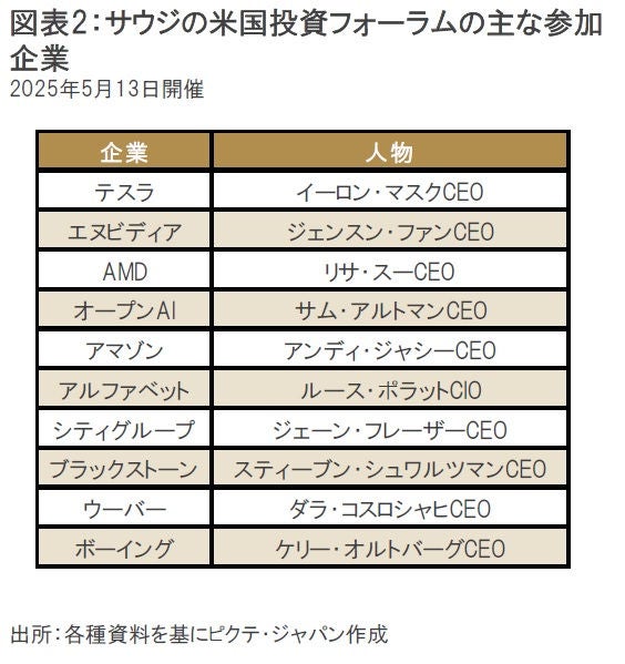 これだけのディールが同時に発表されたのには理由がある。トランプ氏のサウジ訪問に合わせて、首都リヤドでは米国投資フォーラムが開催された。そこに招待されたのは、テスラのイーロン・マスクCEOやオープンAIのサム・アルトマンCEO、エヌビディアのジェンスン・ファンCEOのほか、アマゾンやアルファベット、シティグループ、ブラックストーン、ウーバー、ボーイングといった米国の名だたる企業の最高経営者たちだ(図表2)。このイベントに備えて、実務者レベルで事前にディールのすり合わせが行われていたと考えるのが自然だろう。