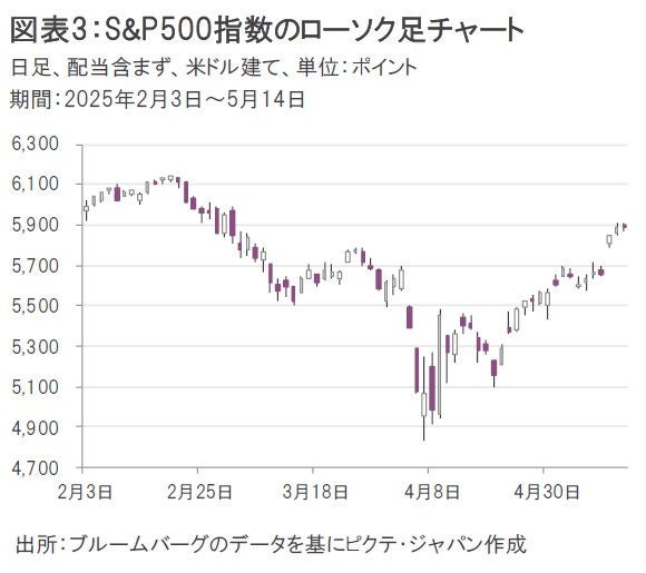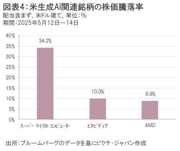 米国株式市場では、スイスで行われた米中貿易協議で米中追加関税が大幅に引き下げられたことに加え、今回の米国とサウジの大型ディールが好感されている。特に時価総額が比較的大きな生成AI関連株の上昇が目立っており、S&P500指数は最高値更新まであと4.3%となった(2025年5月14日時点、終値ベース)(図表3、4)。