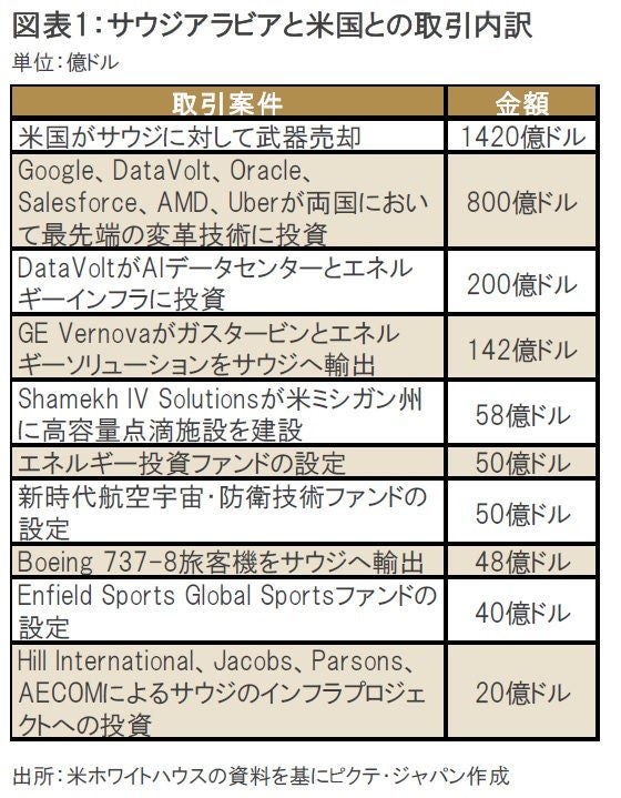 ホワイトハウスは5月13日、トランプ米大統領がサウジアラビア滞在中にサウジ政府および企業との間で、約6,000億ドルの取引を確保したと発表した(図表1)。ホワイトハウスが発表したファクトシートによれば、米国はサウジに対して約1,420億ドル相当の武器売却で合意しており、ミサイル防衛、空軍・宇宙開発、海上安全保障、通信など多岐にわたる分野を含んでいる。テクノロジー分野では、グーグル、オラクル、セールスフォース、AMD、ウーバーの米国企業5社と、サウジのデータセンター会社であるデータボルトが、両国で最先端技術に対して約800億ドルの投資を行う計画だ。また、データボルトは米AI(人工知能)サーバー大手のスーパー・マイクロ・コンピューターと複数年にわたる提携を発表し、米国のAIデータセンター向けに200億ドル規模の超高密度GPUプラットフォームとラックシステムへの投資が決定された。