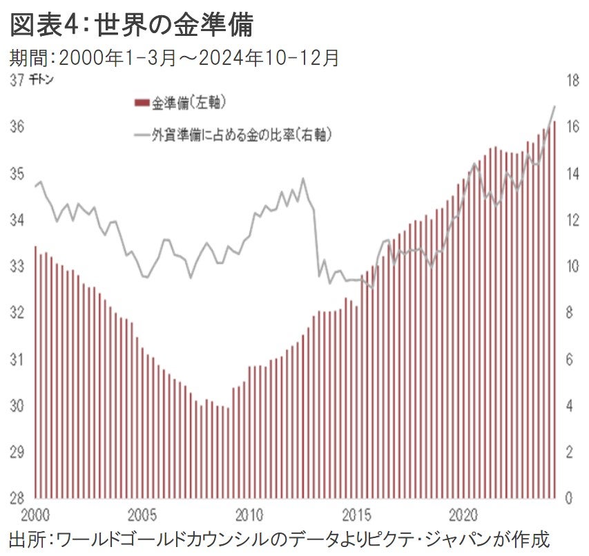 2013年3月末に9.6%まで低下していた外貨準備に占める金の比率は、2024年末に16.9%になった(図表4)。絶対量で見ても、2009年3月末は2万9,964トンだったが、2024年末は3万6,250トンへと大幅に増加している。
