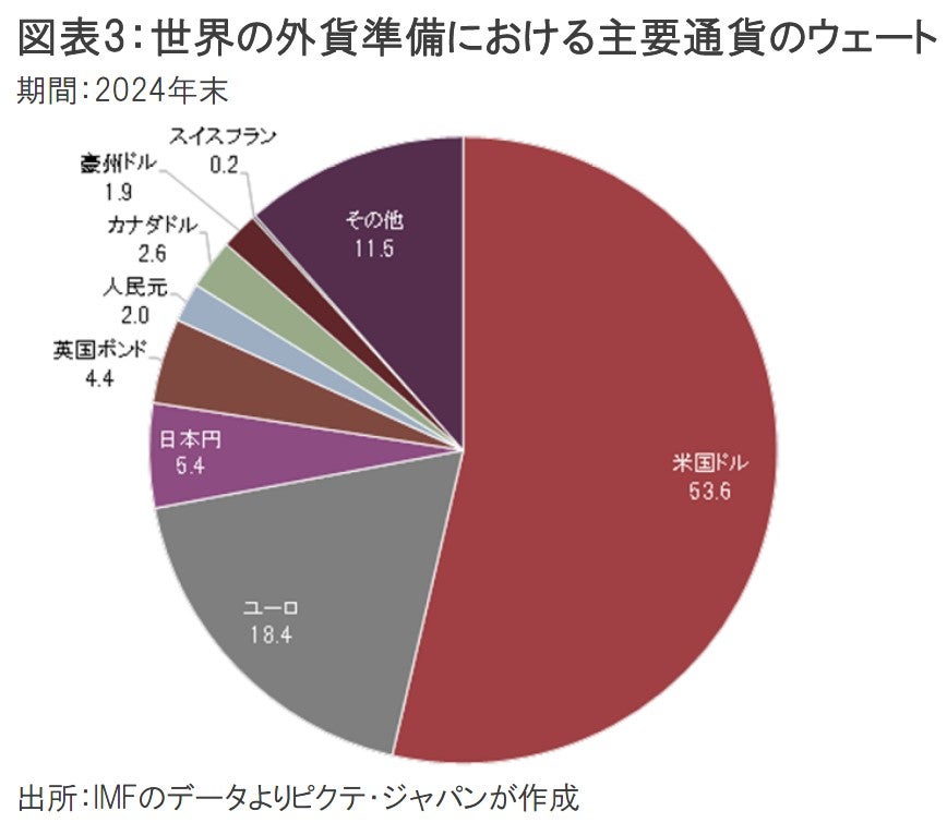 その結果、相手国・地域は外貨準備の中心にドルを据えざるを得ず、ドルは基軸通貨になったわけだ。IMFによれば、2024年末時点において、世界の外貨準備の53.6%をドルが占めていた(図表3)。ドルに次ぐのがユーロだが、まだウェートは18.4%に止まり、外交・安全保障面、経済でも存在感を高める中国の人民元は2.0%に過ぎない。