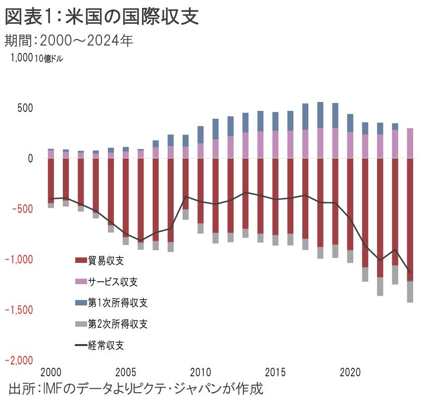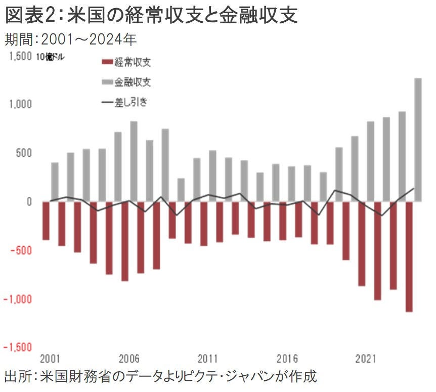 もっとも、貿易赤字を極端に重視して輸入品に高率の関税を掛けるのは、唯一の覇権国となった米国の強さに関する根本的な理解に欠けるのではないか。米国の巨大な経常赤字は、国際収支上、金融収支の黒字と均衡してきた(図表2)。つまり、米国の国民は稼ぐ以上に消費をして豊かな暮らしを享受する一方、結果として生じる巨額の借金については、世界がファイナンスしてきたわけだ。その債務の約束手形がドルに他ならない。