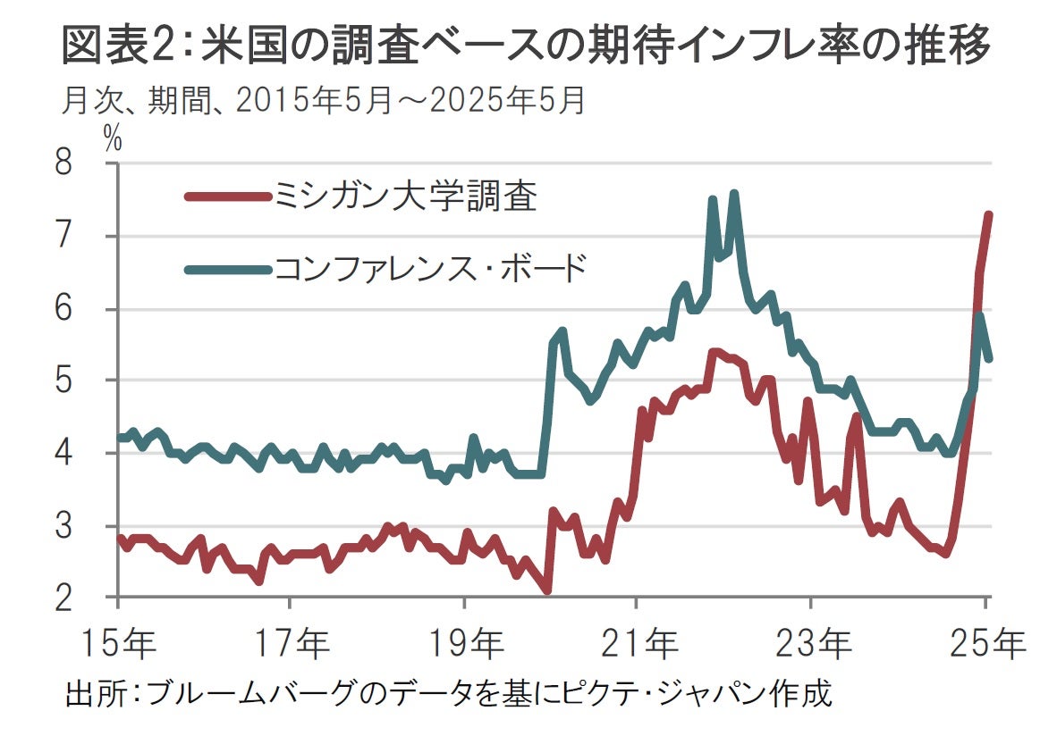 一方で、ニューヨーク(NY)連銀のウィリアムズ総裁は28日に、消費者のインフレに対する認識の変化に注意を払うべきと指摘し、期待インフレ率にも注目すべき点があることを示唆している。ウィリアムズ総裁はコロナ禍の前後で消費者のインフレに対する認識が変わった点を強調している。NY連銀の調査ではインフレを知らなかった若い世代のインフレ認識が、この5年で大きく変化した点などをその証拠として挙げている。図表2をみても、消費者のインフレに対する認識はコロナ禍前後で変わった可能性は確かにありそうだ。