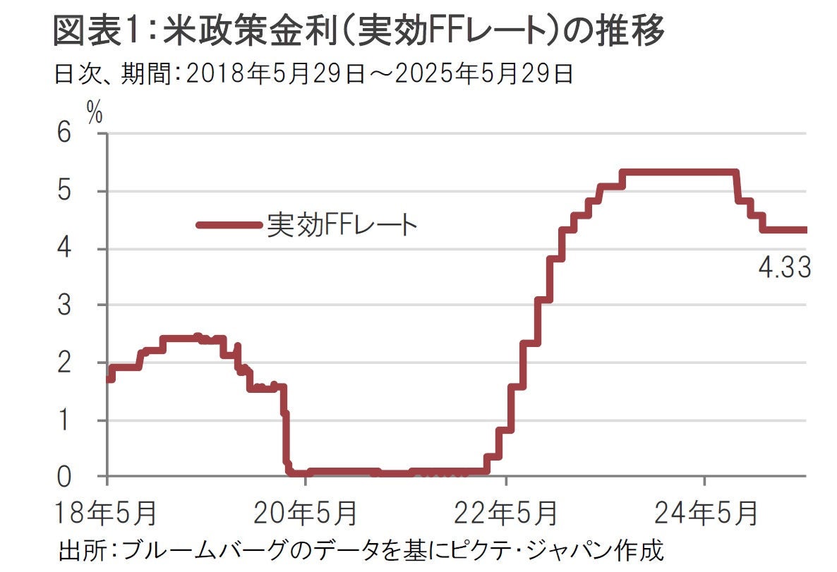 米連邦準備制度理事会(FRB)は5月28日、今月6日~7日開催の米連邦公開市場委員会(FOMC)の議事要旨を公表した。なお、5月のFOMCでは市場予想通り、政策金利の指標であるフェデラルファンド(FF)金利が4.25〜4.50%で据え置かれた(図表1参照)。