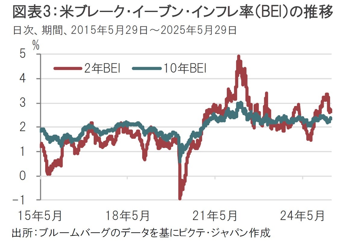 もっとも、物価連動債から算出される市場ベースの期待インフレ率(ブレーク・イーブン・インフレ率)は長期、短期ともに足元比較的落ち着いている(図表3参照)。短期の期待インフレ率は昨年後半から移民政策も含めたトランプ政策の影響を背景に上昇傾向だったが、足元では落ち着きも見せている。また長期の期待インフレ率は物価目標の2%をやや上回る水準近辺での動きにとどまっている。政策、特にFRBへの市場の信認は残っていることが大きな要因ではないだろうか。