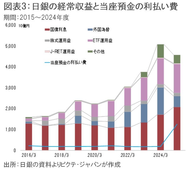 一方、政策金利を上げる際には、同時に当座預金の付利金利を引き上げなければならない。0.5%の利上げだと、単純計算で年間2兆7千億円程度、利払い費が増加する。予見が困難な外貨差益を除けば、国債からの受取利息やETFの配当金などを合わせ、日銀の経常収入は4兆円程度がベースだ。政策金利を1%へ引き上げると、経常収支は赤字になるだろう(図表3)。