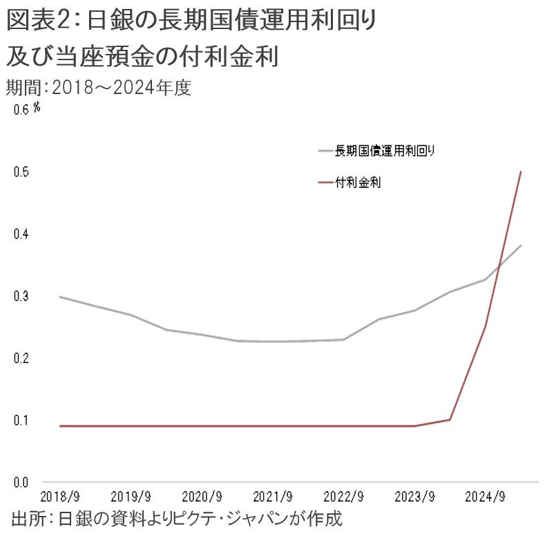 一方、2025年3月期決算で最も特徴的だったのは、日銀が保有する長期国債の運用利回りを当座預金の付利金利が初めて上回ったことだ(図表2)。つまり、逆鞘になったのである。