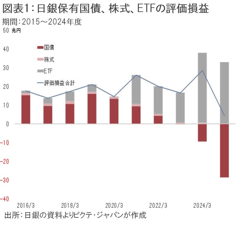 市場金利の上昇により、2025年3月期、日銀が保有する長期国債の評価損は28兆6,246億円に達した(図表1)。もっとも、長期国債は満期保有を前提に、償却原価方式で会計されており、評価損が金融政策に影響を及ぼすとは考え難い。また、ETFの評価益は32兆8,713億円であり、保有資産全体では評価益が維持されていた。