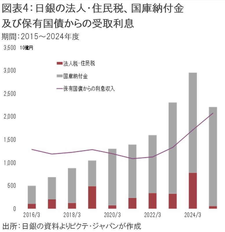 また、2020年3月期以降、日銀が払う法人税・住民税及び国庫納付金は、日銀が受け取る国債の利息を上回っていた(図表4)。2025年3月期は、日銀の国債からの受取利息2兆774億円に対し、法人税・住民税570億円、国庫納付金2兆1,511億円、計2兆2,081億円だ。付利金利の支払いが大幅な減益要因となり納税額が減少、政府にとっての対日銀収支は黒字幅が大きく縮小している。