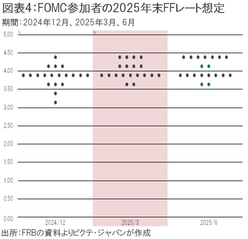6月17、18日のFOMCで、FRBはFFレートの誘導水準を4.25~4.50%で据え置いた。3ヶ月毎に発表される参加者19名の経済見通しでは、2025年末におけるFFレートの想定値(中央値)が、昨年12月、今年3月に続き3.875%になっている。つまり、年内2回の利下げを織り込んだ水準だ。