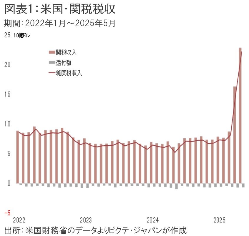 米国財務省によれば、5月の関税税収は還付額を除いたネットベースで前年同月比4.2倍の222億ドルだった(図表1)。4月の156億ドルからさらに大きく増加している。ちなみに、昨年の月間平均は72億ドルだ。4月以降、関税税収の急拡大は、トランプ政権による関税政策が理由だろう。