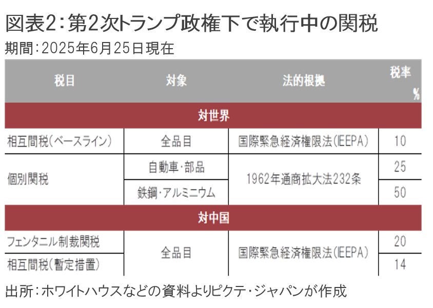 トランプ大統領は、4月9日、一旦は発動した相互関税を中国以外の国・地域については中断した。スタグフレーションのリスクを懸念、長期金利が急上昇し、株価が大きく下落したことが背景ではないか。それでも、現在、ベースラインとして中国を除く全輸入品へ10%の相互関税を課している(図表2)。また、自動車・部品に25%、鉄・アルミニウムに50%の個別関税が導入された。
