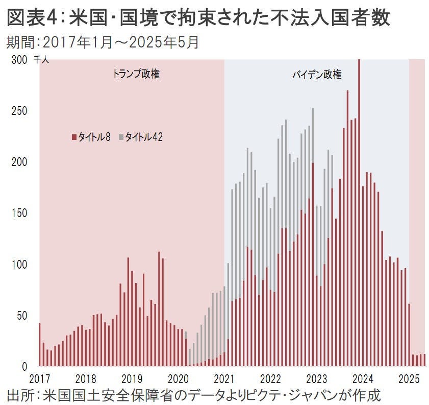 第2次トランプ政権発足後、メキシコとの国境で拘束された不法入国者は、バイデン政権の月間平均18万3,069人から、同1万1,802名へと激減している。国境管理を強化するだけでなく、不法入国者の強制送還に乗り出したことで、正当な資格なく米国を目指すのは難しくなったと言えよう。