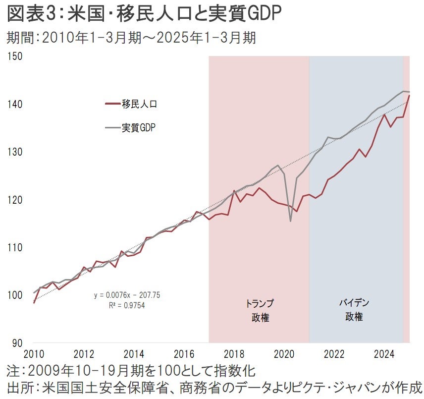 オバマ政権以前、米国の実質経済成長率は、移民人口の伸びとほぼ一致していた(図表3)。不法入国者を含め、移民が生産に参加し、消費をすることで、米国経済は成長してきた感がある。