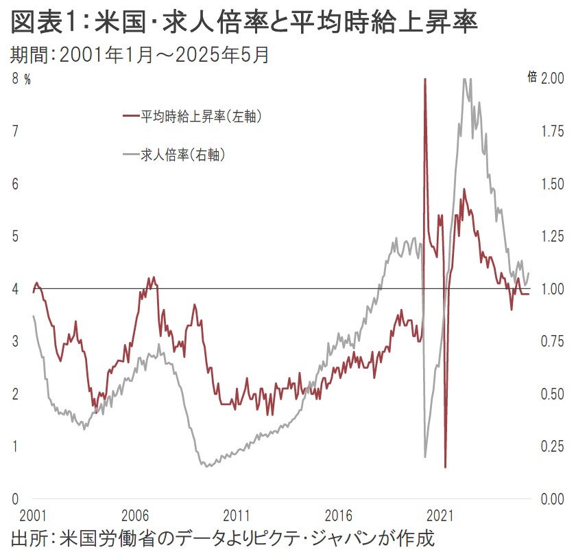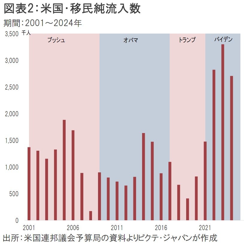 今年に入って米国の労働需給が再び引き締まりつつある背景は、トランプ大統領による移民政策ではないか。第1次トランプ政権下の2017~20年、米国に流入する移民はネットベースで年平均75万人だった(図表2)。これは、ジョージ・W・ブッシュ政権の同122万5千人、バラク・オバマ政権の同98万7千人と比べ大幅な減少だ。