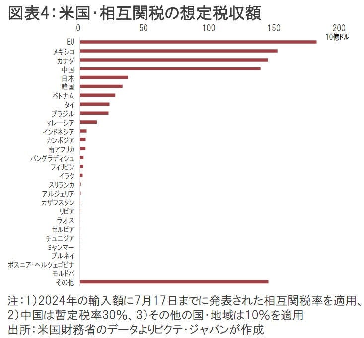 トランプ大統領は、7月7日以降、8月1日から適用するとした新たな相互関税の税率を断続的に発表している(図表3)。17日現在、その数は25ヶ国・地域に達したが、このうち米国との貿易協定に至ったのはインドネシアのみだ。2024年の輸入額を使い、当該25ヶ国・地域からの輸入品に発表通りの税率で課税(中国は暫定税率の30%を適用)、他の国・地域からの輸入品にはベースラインとして10%の関税を課す場合、年間の関税税収は合計で9,000億ドルを超える(図表4)。2024年度の関税総額は814億ドルなので、10倍以上に達するわけだ。