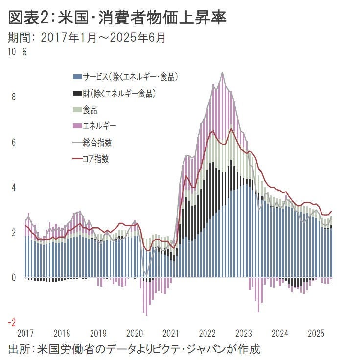 しかし、6月の消費物価統計では、総合指数が市場予想の前年同月比2.6%を0.1%ポイント上回る2.7%上昇、コア指数は市場予想通りの2.9%上昇になった(図表2)。4月の同2.3%を底として、総合指数は2ヶ月連続の上昇率拡大である。