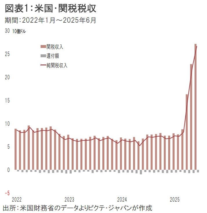 米国財務省によれば、6月の関税税収は271億5,458万ドルに達し、5月の221億7,256億ドルからさらに拡大した(図表1)。昨年の月間平均65億7,642万ドルに比べ4.1倍に膨らんだのは、トランプ大統領による関税政策の影響である。