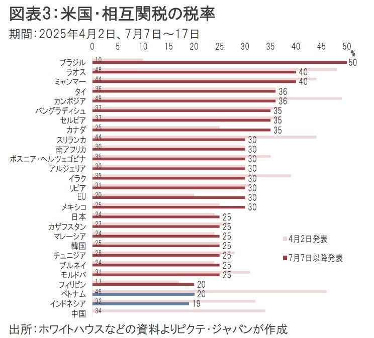 ドナルド・トランプ大統領は、7月7日以降、断続的に相互関税の新たな税率を発表し、8月1日より課税するとしている。ただし、この税率を適用した場合、関税税収は9,000億ドルを超え、2024年実績の10倍以上になるだろう。一部は輸出側の企業が値引きするとしても、かなりの部分は米国の消費者負担となる見込みだ。大幅増税の実現は難しく、結局、交渉ための武器なのではないか。