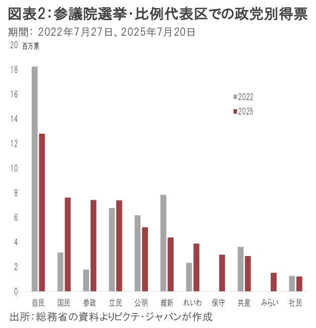 特に注目されるのは、比例代表区において、国民民主党が762万票を得て自民党に次ぐ2位、参政党も743万票に達して3位になったことではないか(図表2)。選挙区を合計した獲得議席で立憲民主党は22議席と改選野党第1党の座を維持したものの、比例区での総得票は740万票で4位に終わった。また、日本保守党が298万票を獲得、287万票の共産党を抑えて8位になっている。