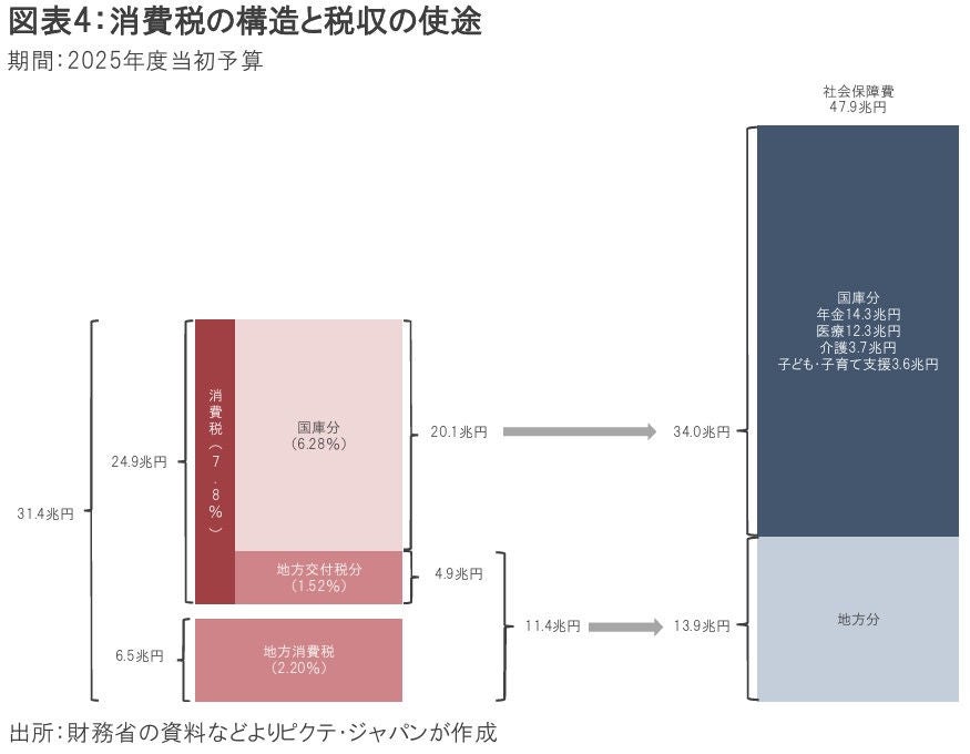 2025年度当初予算では、消費税収は全体で31兆4千億円だが、社会保障支出は国と地方を合わせて47兆9千億円に達し、現在の税率でもその全額を埋め切れていない(図表4)。仮に消費税減税となれば、社会保障財源が大きな論点になるだろう。