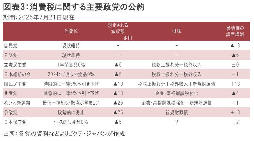 参院選で主要野党は軒並み消費税減税を公約に掲げた(図表3)。自公両与党内でも、政権立て直しのため財政政策の拡充を求める声が強まるのではないか。
