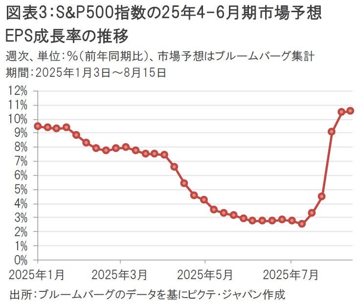さらに、4-6月期の市場予想EPS成長率は7月11日時点の前年同期比+2.5%から8月15日時点では同+10.5%まで上方修正されるなど、その修正幅も大きかった(図表3)。