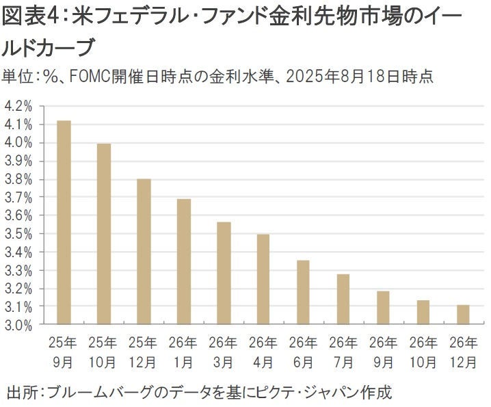 S&P500指数の上昇をもたらした2つ目の要因が、FRB(米連邦準備制度理事会)の利下げ期待だ。前述の米雇用統計の下振れを受け、米国ではFRBの利下げ期待が一層高まり、来年12月のFOMC(米連邦公開市場委員会)までにおよそ5回分(1回分=0.25%)の利下げが金融市場で織り込まれている(図表4)。