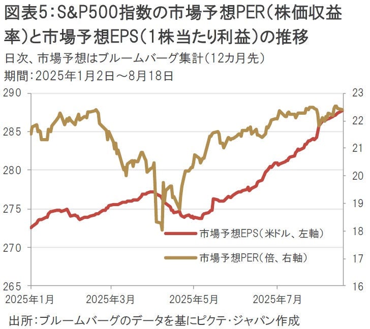 S&P500指数の市場予想PER(株価収益率、12カ月先)は22.4倍と割高感があるものの、利下げ期待によってバリュエーションがさらに切り上がる可能性が高まったことも、S&P500指数が最高値を更新する原動力になったと考えられる。