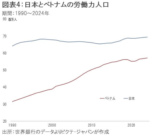 他方、ベトナムの人口は1億134万人で、14億人を超えるインドや中国の7%程度だ。もっとも、国民の平均年齢は32.8歳と若い上、昨年の合計特殊出生率は1.91に達した。2024年の労働力人口は5,713万人で日本の約8割だが、過去30年間、年率1.7%の高い伸びを示している(図表4)。