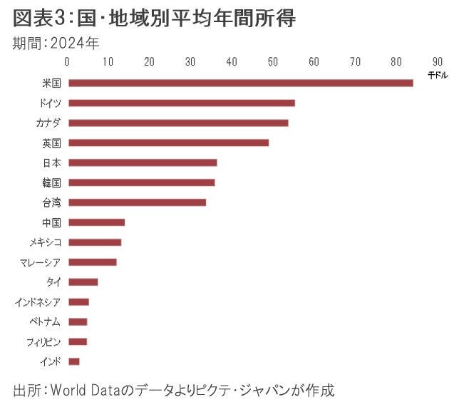 2024年におけるベトナムの年平均所得は4,490ドルで、米国の8万3,660ドルと比べ20分の1だ(図表3)。対中国でも3分の1に過ぎず、労働コストから見て、20%の関税率を課されても、ベトナムは米国市場で十分に競争力を確保できるだろう。