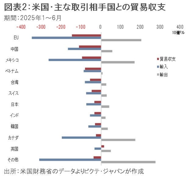 今年1-6月における米国の貿易収支を見ると、対ベトナムの赤字額は813億ドルであり、EU、中国、メキシコに次ぐ4番目である(図表2)。特にベトナムへの輸出額が7億ドルに過ぎず、米国の主要な貿易相手国としては際立って少ない。