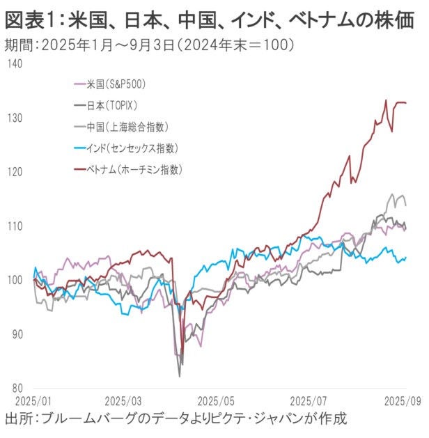 トランプ政権による関税の暴風雨にも関わらず、日本、米国など多くのマーケットで株価は堅調に推移してきた。もっとも、日米市場を大きく上回るパフォーマンスを示しているのがベトナムに他ならない。9月3日時点において、TOPIXの年初来上昇率は9.5%、S&P500は10.6%だが、ベトナムの代表的な株式指数であるホーチミンインデックスは32.7%に達している(図表1)。